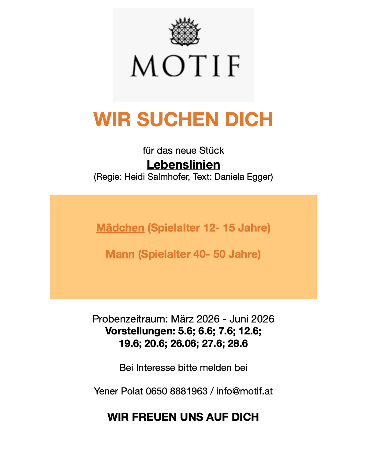 Für das neue Stück Lebenslinien (Regie: Heidi Salmhofer; Text: Daniela Egger) suchen wir ambitionierte Leute, welche Lust haben am Schauspiel. Geprobt wird ab März 2026 nach Absprache ca. einmal die Woche in Bregenz.
